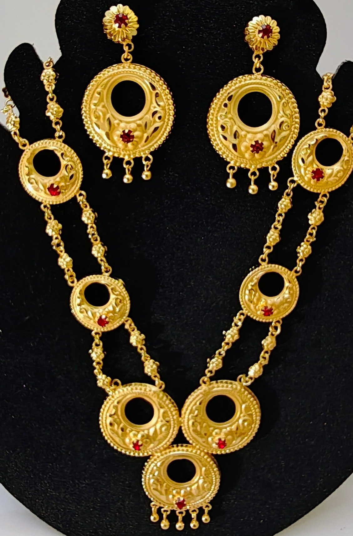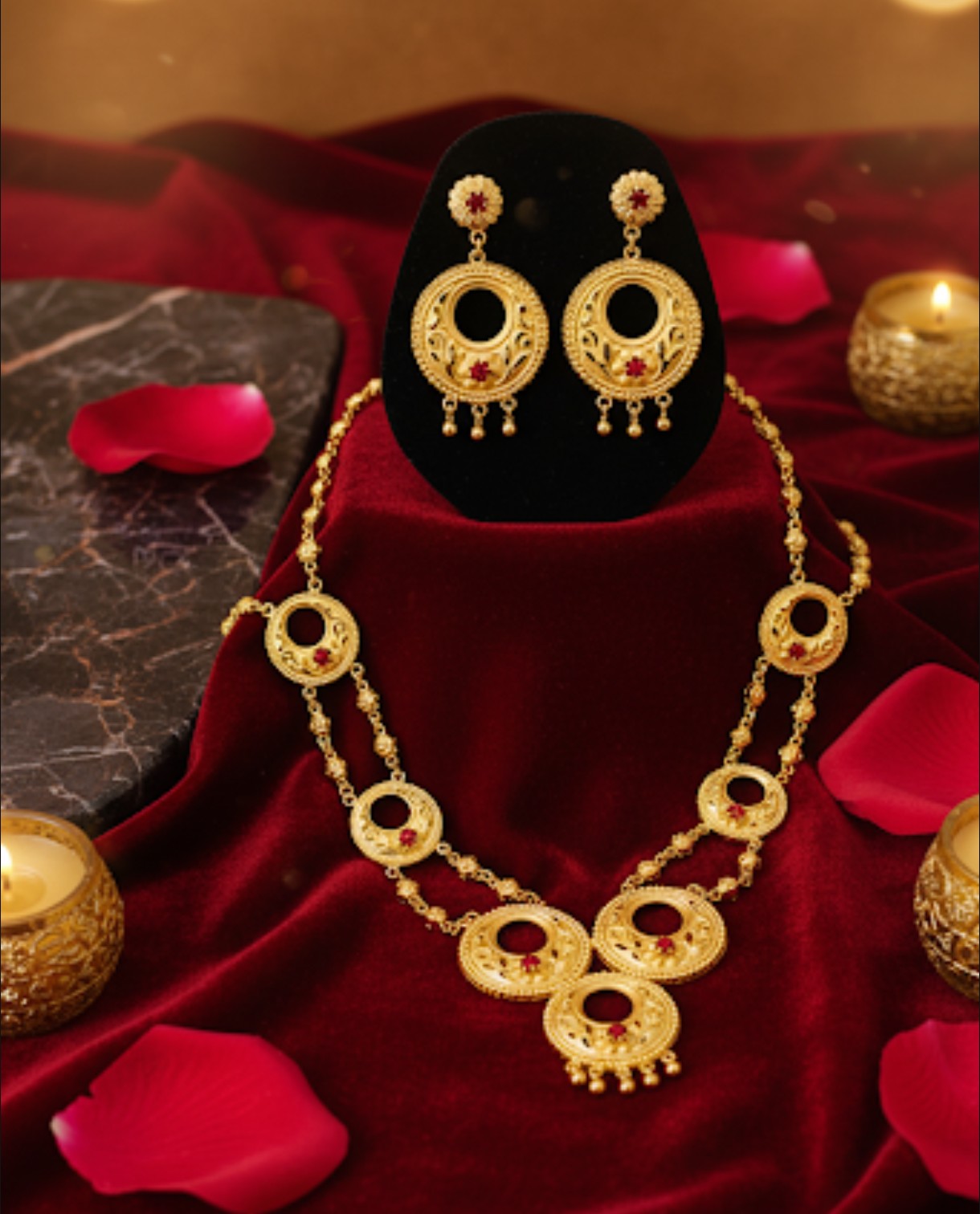Experience the ultimate golden glow! This exquisite 24-Karat Gold Plated Necklace captures the pure, rich radiance of solid gold look a like, delivering instant glamour to traditional look.