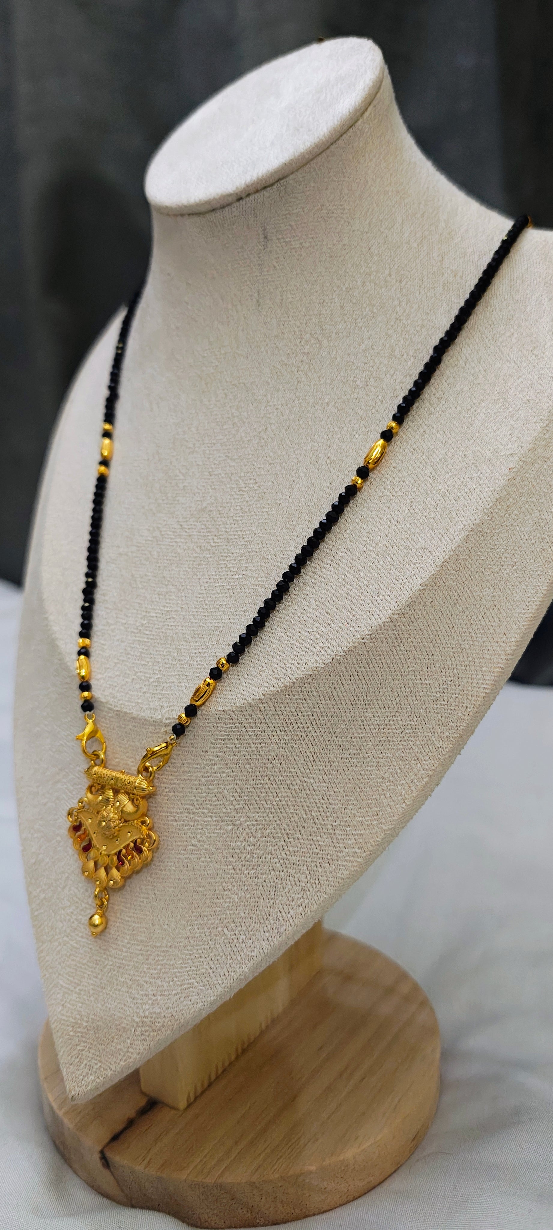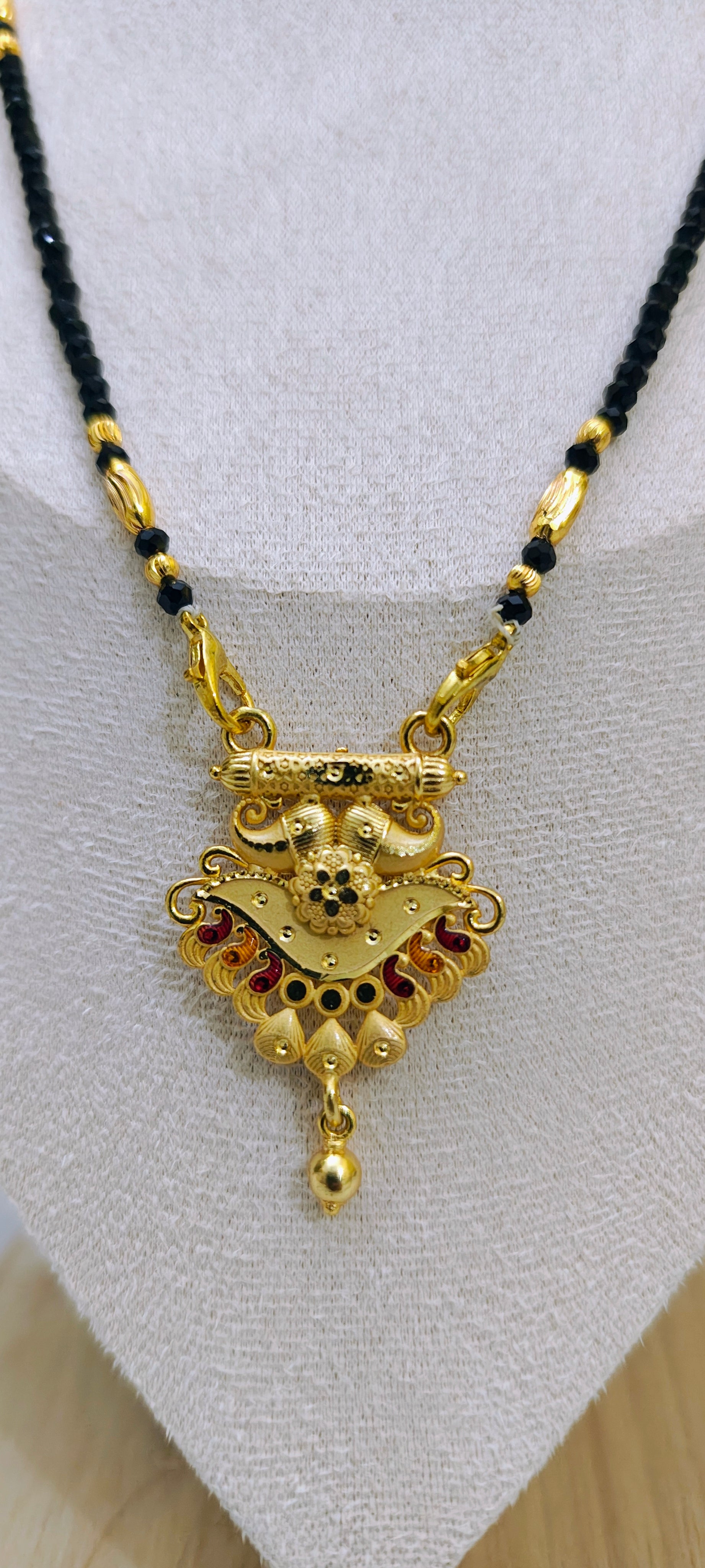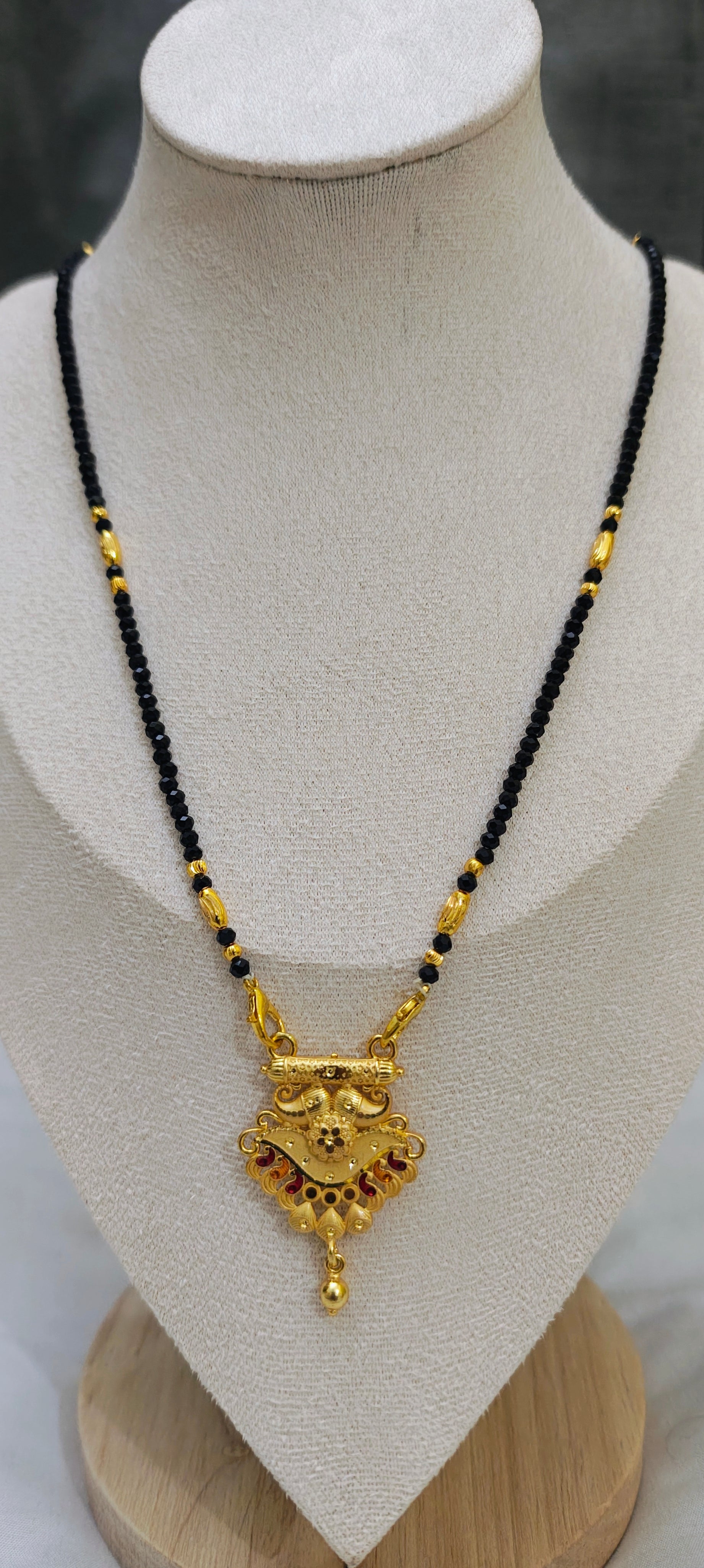 Celebrate tradition with elegance through this beautifully crafted 24 carat gold plated mangalsutra, designed especially for comfortable daily wear. Featuring classic black beads with delicate gold bead detailing, this mangalsutra is highlighted by a graceful dome-shaped pendant that adds a subtle traditional charm.