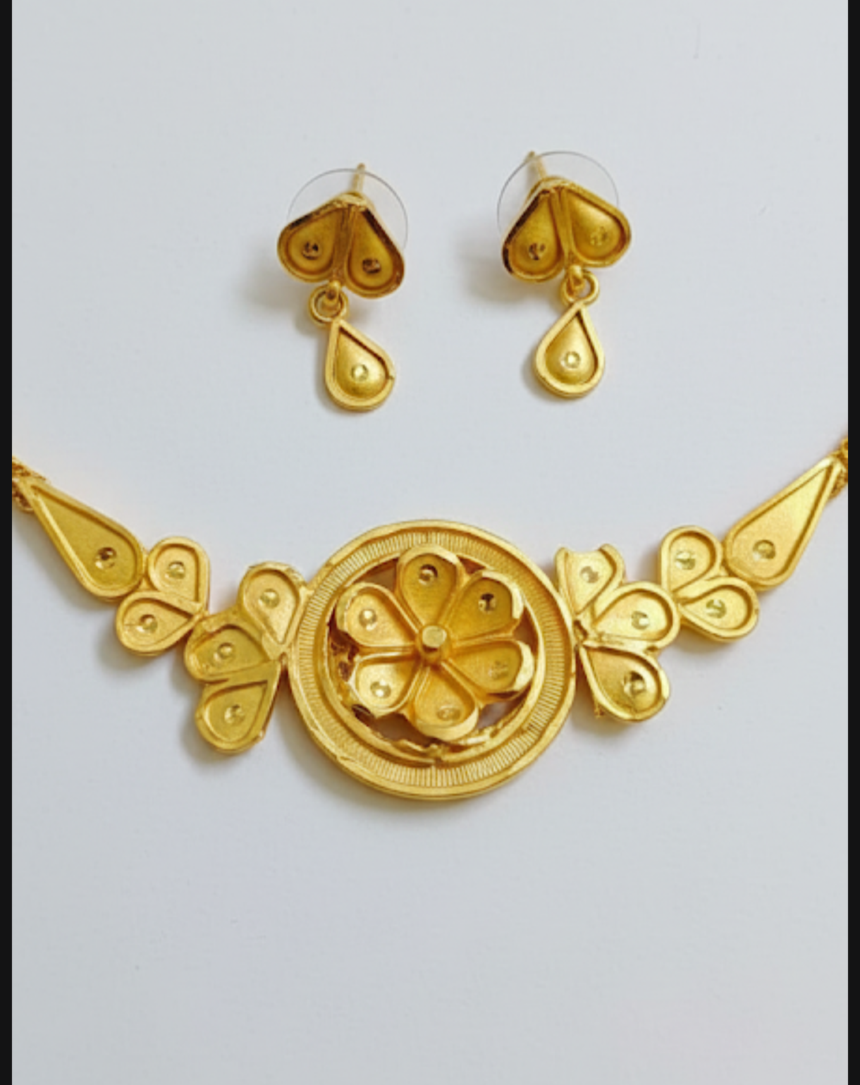 Elevate your jewellery collection with this beautifully crafted gold-plated floral choker. Designed with intricate teardrop elements and a classic round motif, this piece offers the richness of real gold while remaining lightweight and comfortable. The matte gold finish gives it a premium traditional look, perfect for sarees, kurtis, lehengas, and Indo-western outfits.