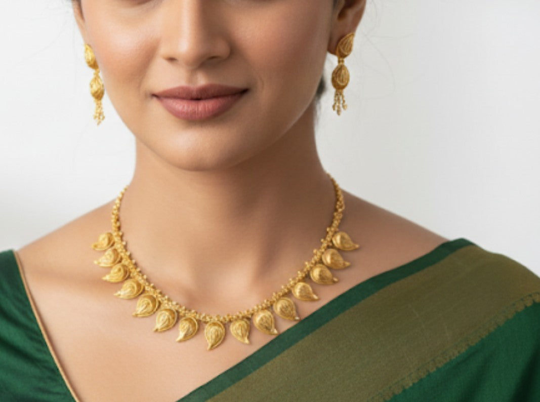 Elevate your jewellery collection with this beautifully crafted gold-plated pata motifs necklace Designed with intricate elements and a classic leaf motif, this piece offers the richness of real gold look while remaining lightweight and comfortable. The matte gold finish gives it a premium traditional look, perfect for sarees, kurtis, lehengas, and mekhla chador