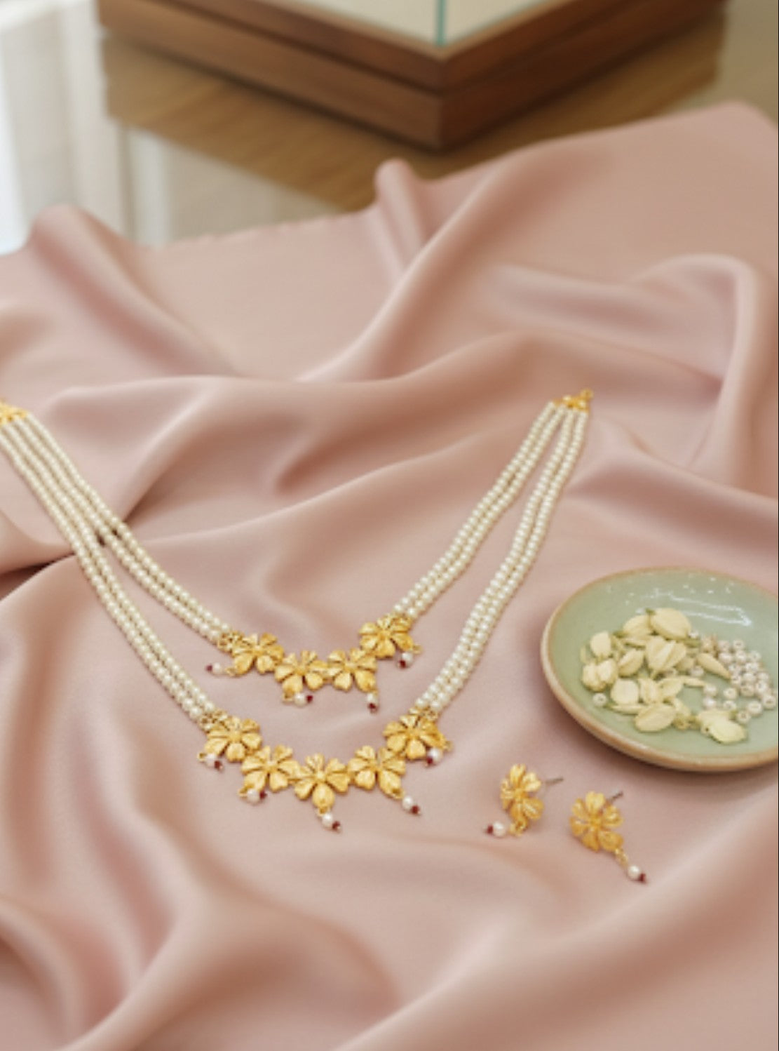 An elegant fusion of luxury and grace, this 24K gold plated pearl necklace features lustrous pearls set in a radiant gold finish. Expertly handcrafted, it showcases timeless beauty with a touch of sophistication. Perfect for weddings, festive occasions, or elegant gatherings, this necklace adds a royal charm to any attire.